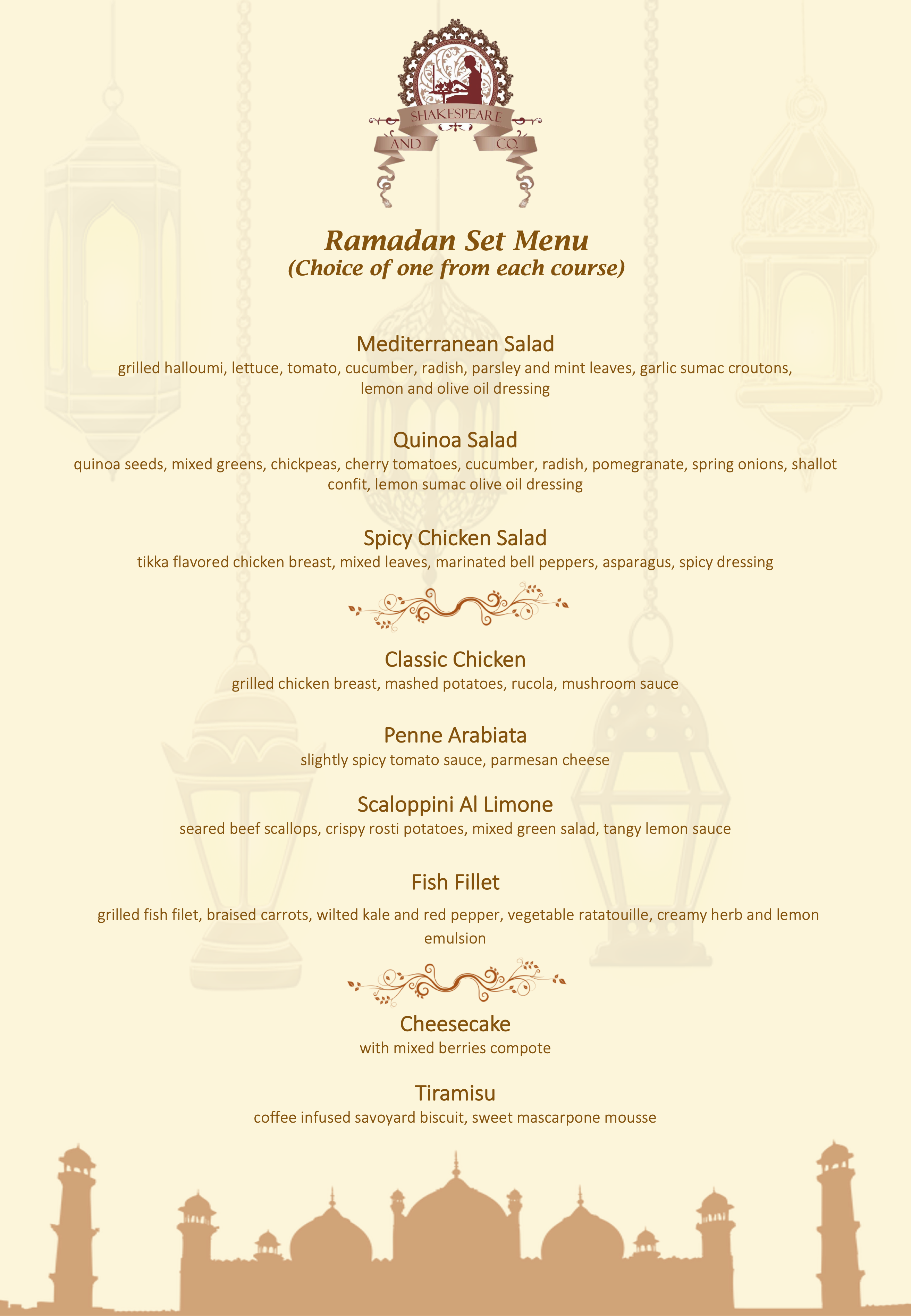 Single set menu includes:● 1 Soup (Choices: Lentil Soup, Chicken Creamy Soup)● 1 Salad (Choices: Fatoush, Tabouleh, Hommus, Mutable)● 1 Hot Appetizer (Choices: Cheese Roll, Fried Kibbeh)● 1 Main Course (Choices: Mixed Grill, Dish of the day)● 1 Ramadan Juice (Choices: Tamer Hindi, Laban Ayyran, Vimit)● Dates