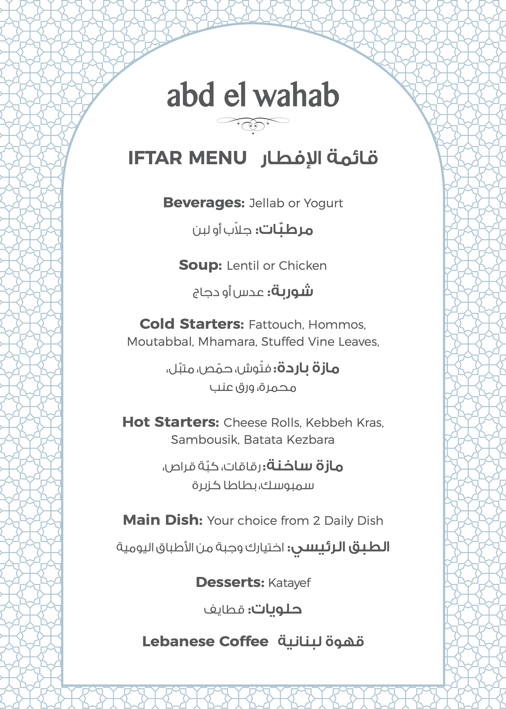 Iftar menu includes:● 1 Lentil Soup● 1 Fatouch or Tabouleh● 1 Hommos or Moutabel● 1 Kebbeh Akras ● 1 Mohalbeya● 1 Soft drink or 1 Jalab● Choose 1 from the daily main dish