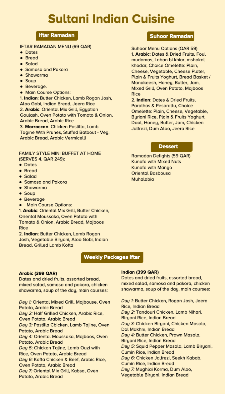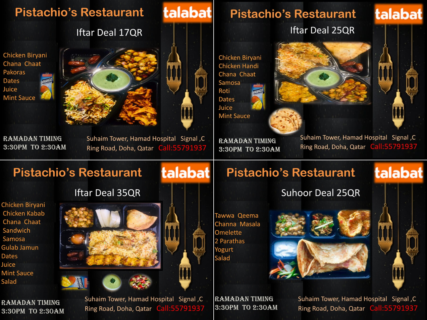 ● Iftar Deal (QAR 17): Chicken Biryani, Chana Chaat, Pakoras, Dates, Juice, Mint Sauce● Iftar Deal (QAR 25): Chicken Biryani, Chicken Handi, Chana Chaat, Samosa, Roti, Dates, Juice, Mint Sauce● Iftar Deal (QAR 35): Chicken Biryani, Chicken Kebab, Chana Chaat, Sandwich, Samosa, Gulam Jamun, Dates, Juice, Mint Sauce, Salad